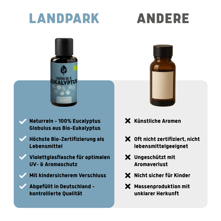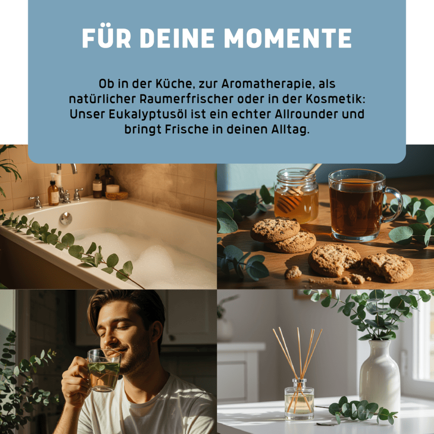 100% ätherisches Eukalyptusöl aus kontrolliert biologischem Anbau. (Botanischer Name: Eucalyptus globulus)