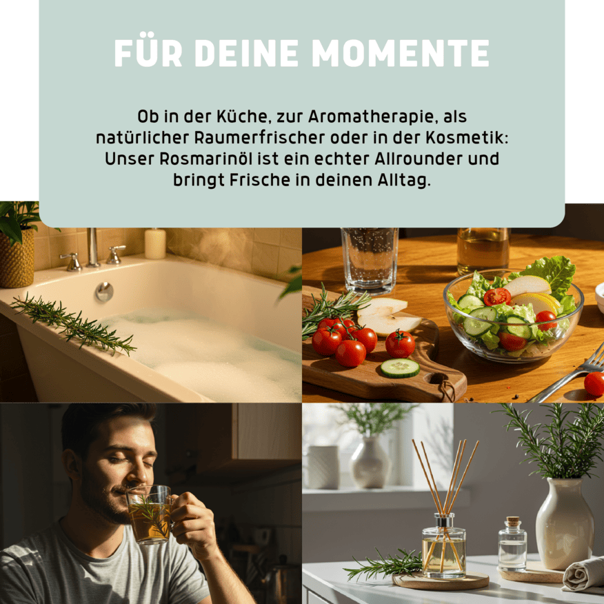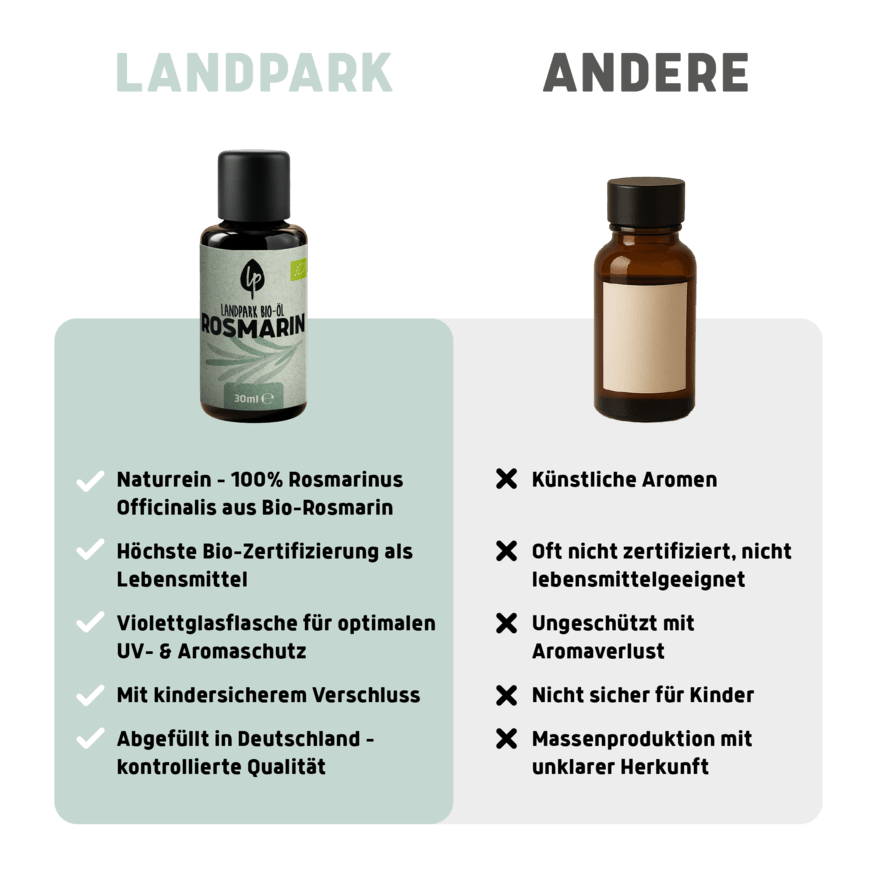 100% ätherisches Rosmarinöl aus kontrolliert biologischem Anbau. (Botanischer Name: Rosmarinus officinalis)