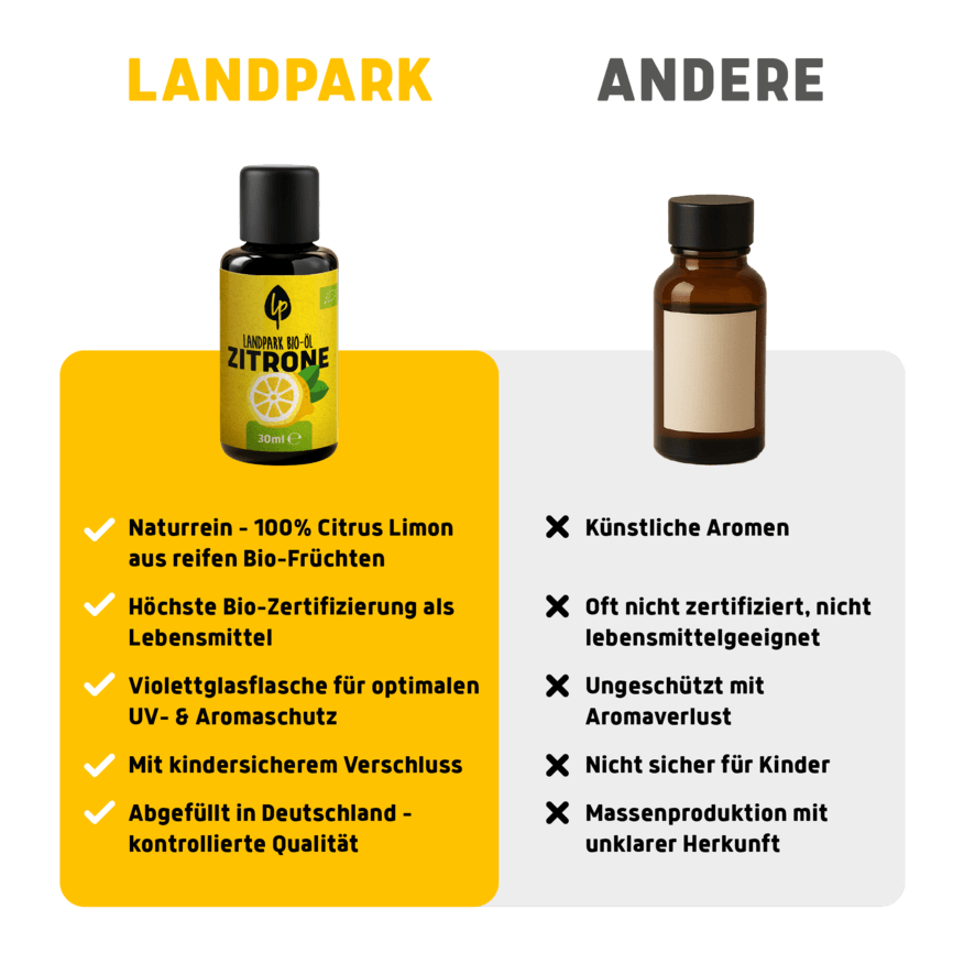 100% ätherisches Zitronenöl aus kontrolliert biologischem Anbau. (Botanischer Name: Citrus limon)