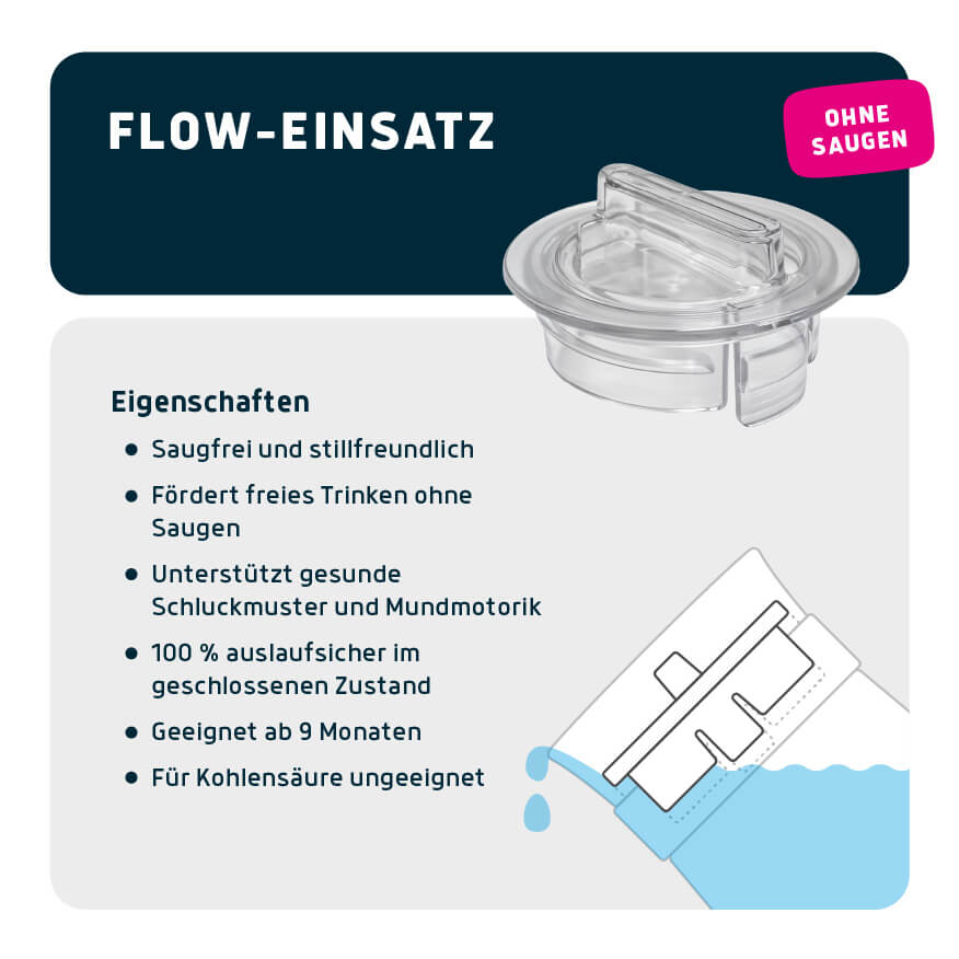 - Der Flow-Einsatz eignet sich ideal, um das freie Trinken ohne Saugen zu fördern. Perfekt für unterwegs oder als Schritt zum "großen" Becher!
