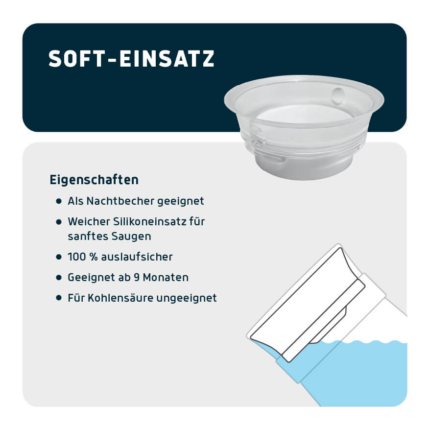- Der Soft-Einsatz mit weichem Silikon ist bestens geeignet als Nachtbecher oder für Kinder, die gerne sanft trinken.